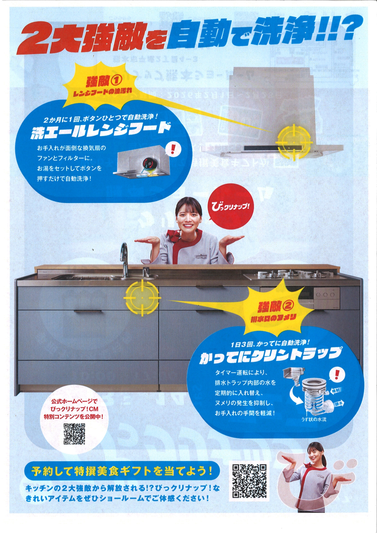 最新のキッチンでは、“洗エールレンジフード”や“かってにクリントラップ”など面倒な掃除がラクになる機能がついており、そちらも実際に見ていただくことができます♪