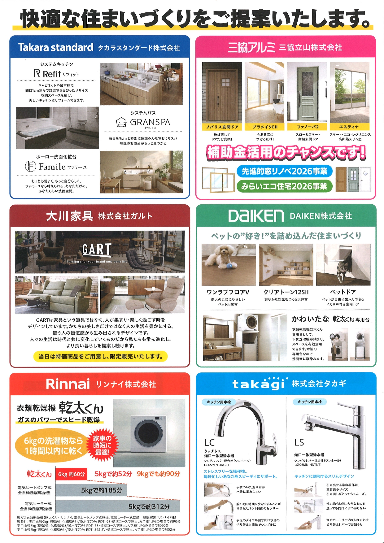 さらに!今回は三協アルミ(サッシ・ドア)・大川家具(家具)・DAIKEN(床材・建具)・Rinnnai(ガス乾燥機)・takagi(水栓)の計5社のメーカーさんが集まり、商品の紹介や特価商品の販売などが行われます。様々なメーカーさんの商品をご覧いただけますので、快適な住まいづくりのアイデアが見つかるかもしれません(^^♪