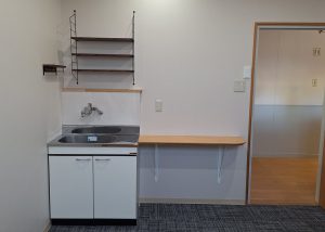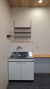 幅800mmのミニキッチンを設置しました。手洗いやちょっとした食器洗いをするにはぴったりの大きさです。